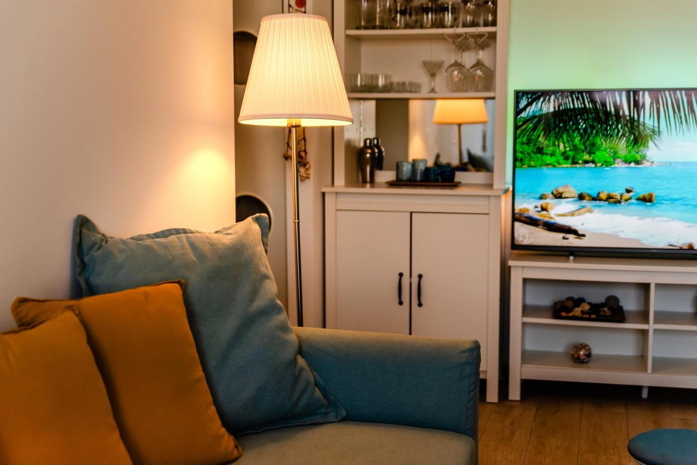 One-Bedroom Apartment. Featuring a private entrance, this air-conditioned apartment comprises 1 living room, 1 separate bedroom and 1 bathroom with a walk-in shower and a hairdryer. The well-equipped kitchen features a stovetop, a refrigerator, a dishwasher and kitchenware. Boasting a terrace with sea views, this apartment also provides a washing machine and a flat-screen TV with streaming services. The unit offers 2 beds.